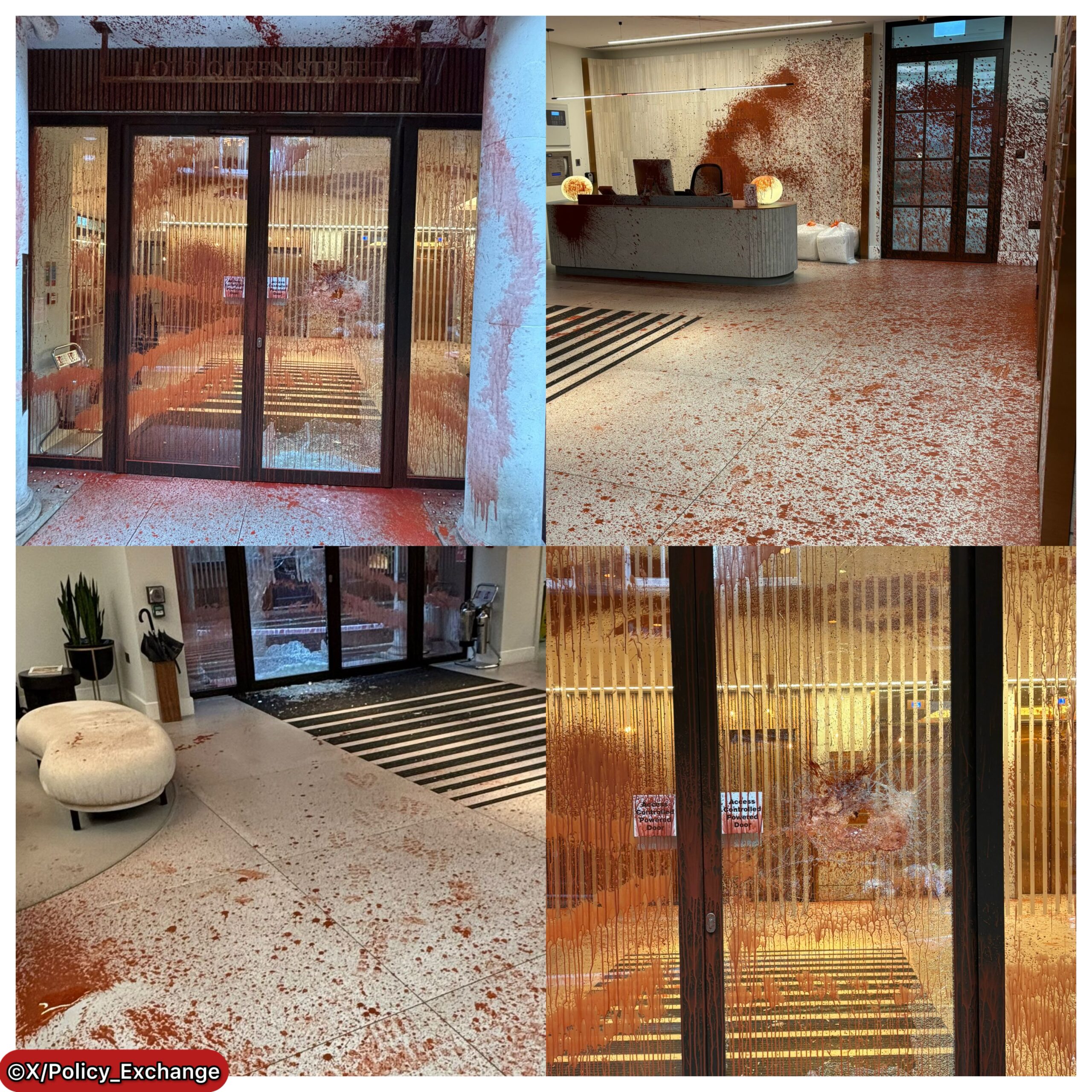 The attack, which occurred on Thursday night, saw activists smash windows and spray blood-red paint across the offices on Old Queen Street, with images revealing extensive destruction to the prestigious research institute’s premises. The perpetrators immediately claimed responsibility, explicitly linking their actions to Policy Exchange’s stance on Palestine Action, which was controversially designated a terrorist organisation by the UK government in July 2025.